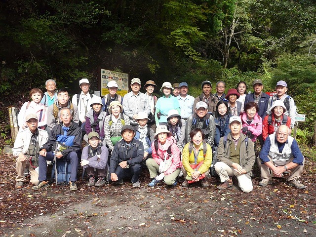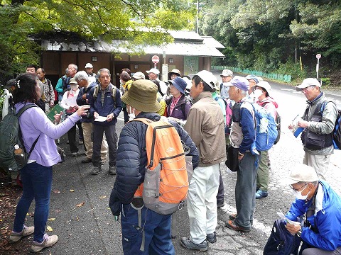2025年11月2日(日)、泉佐野駅9時10分発の犬鳴山行きバスに乗る予定でしたが、この日は「南海沿線七福神祭」と重なり、バスは超満員でした。JR日根野駅でもバス停には大勢の人が並んでいて、全員が乗ることは出来ず、案内人としてはヒヤヒヤしましたが、臨時便バスが出され、予定時間を少し過ぎた頃には全員揃うことが出来ました。会長の挨拶後、資料をお配りし観察会が始まりました。