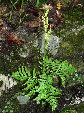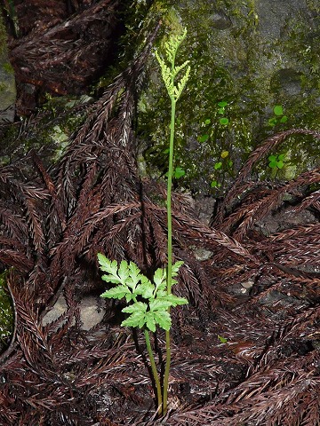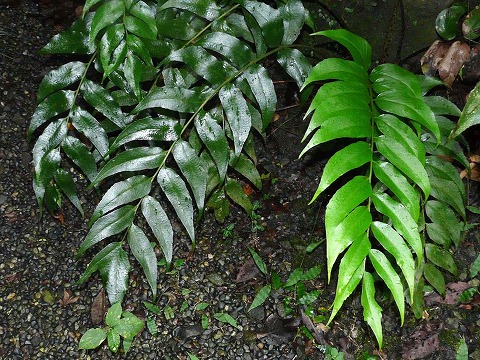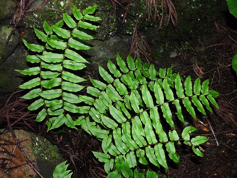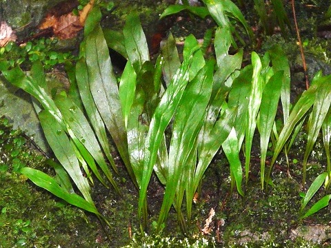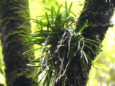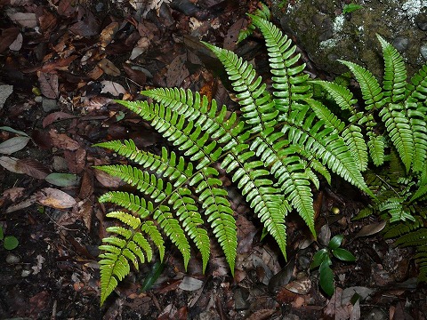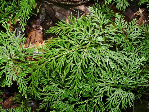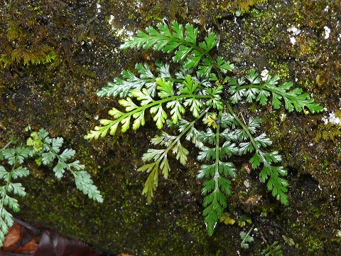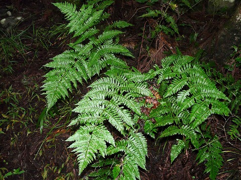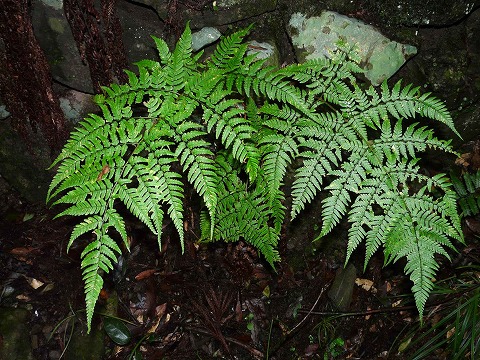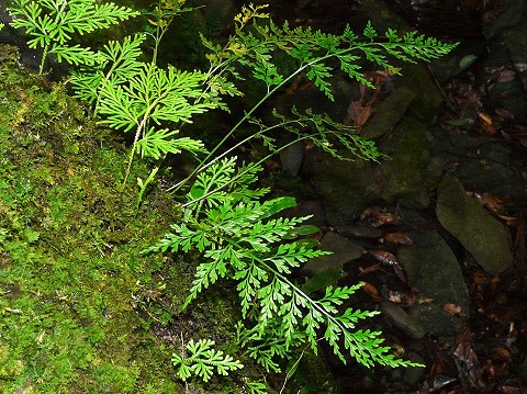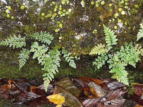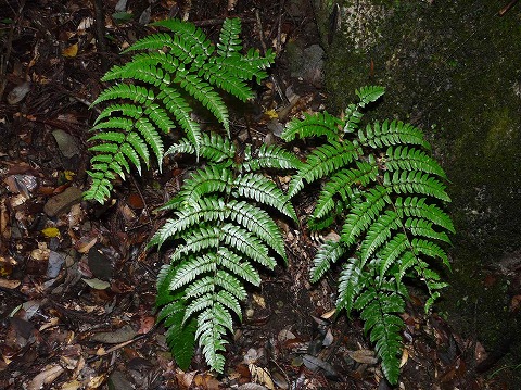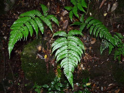 参道入り口の旅館街の前には石垣にコバノヒノキシダ、トキワトラノオ、アイトキワトラノオ、ヒメクラマゴケ、ナガバヤブソテツなどがありました。ノコンギクやコウヤボウキの可憐な花も咲いていました。コバノチョウセンエノキも数本ありました。道路わきの湿った溝のあたりにはオオサンショウソウが地面を覆いつくしていました。一の橋の際にはキジョランの大株があり、冬なのにたくさんの蕾を付けていました。二の橋より上流にはアオガネシダ、シシラン、イワヤナギシダ、カタヒバ、ヒトツバなどのシダが豊富で、クロバイやヤマモモ、ツクバネガシなどの大木もありました。ナガバヤブソテツ、テリハヤブソテツ、ヤブソテツもありました。左手の土手にはスズシロソウ、ヒメイタビがありました。不動堂トイレ横のカヤの木にはフウランもついていました。